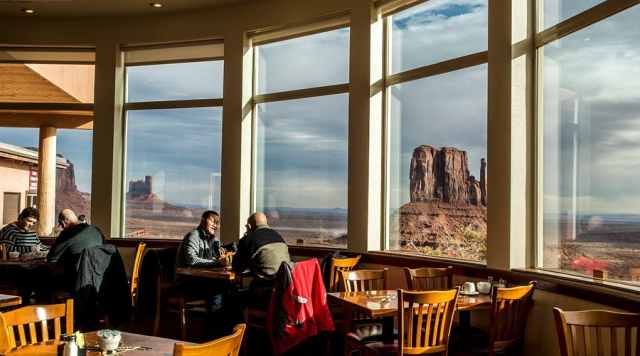 Enjoy Navajo dishes and classic American meals while overlooking the sandstone formations glowing at sunrise and sunset from the dining room.